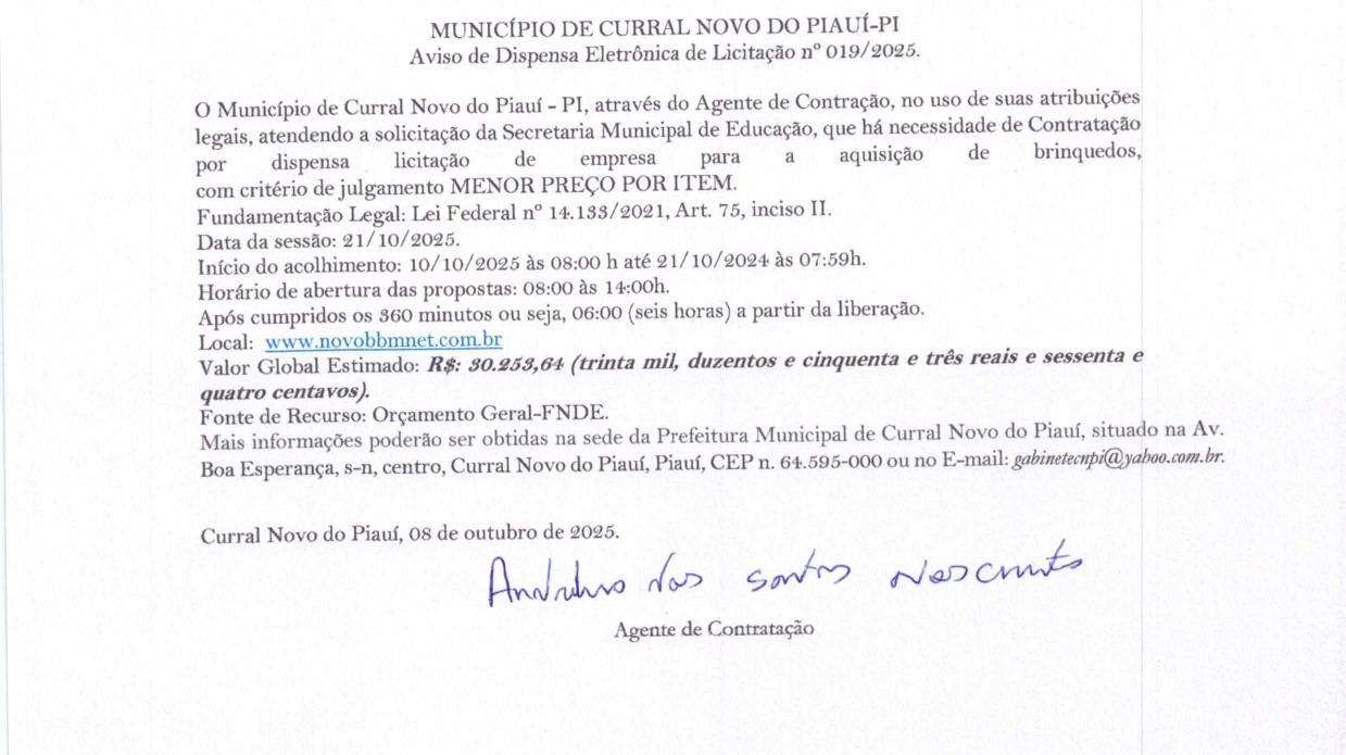AVISO DE DISPENSA DE LICITAÇÃO Nº 019 /2025